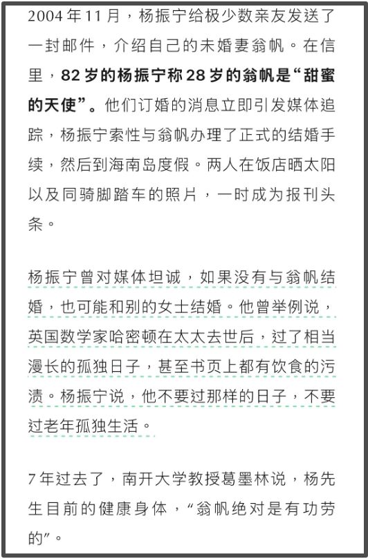 字里行间都能看出翁帆对杨振宁的崇拜和尊敬,并没有外界以为的相差54岁没话聊的尴尬和生疏。
