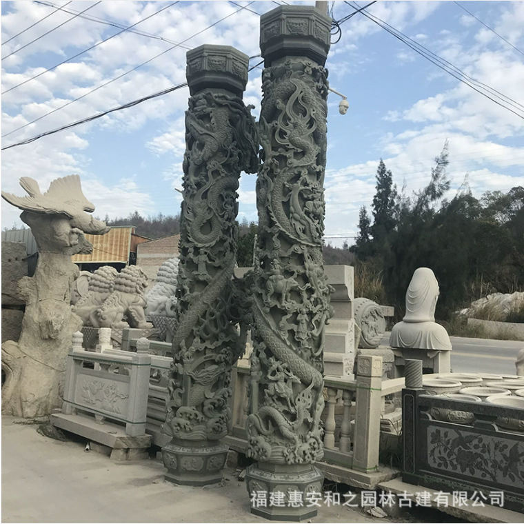 精湛的工艺,则是石雕龙柱另一大看点。制作一根龙柱,需历经采石、设计、粗雕、细刻等数十道工序。匠人们以刀为笔,在坚硬的石材上勾勒龙的筋骨血肉,通过镂空雕、高浮雕等技法,让龙身呈现出腾空而起的动态感。指尖抚过龙鳞,凹凸起伏的触感中,是匠人对分毫之差的执着追求。这种 “石上生龙” 的绝活,让每根龙柱都成为独一无二的艺术珍品。