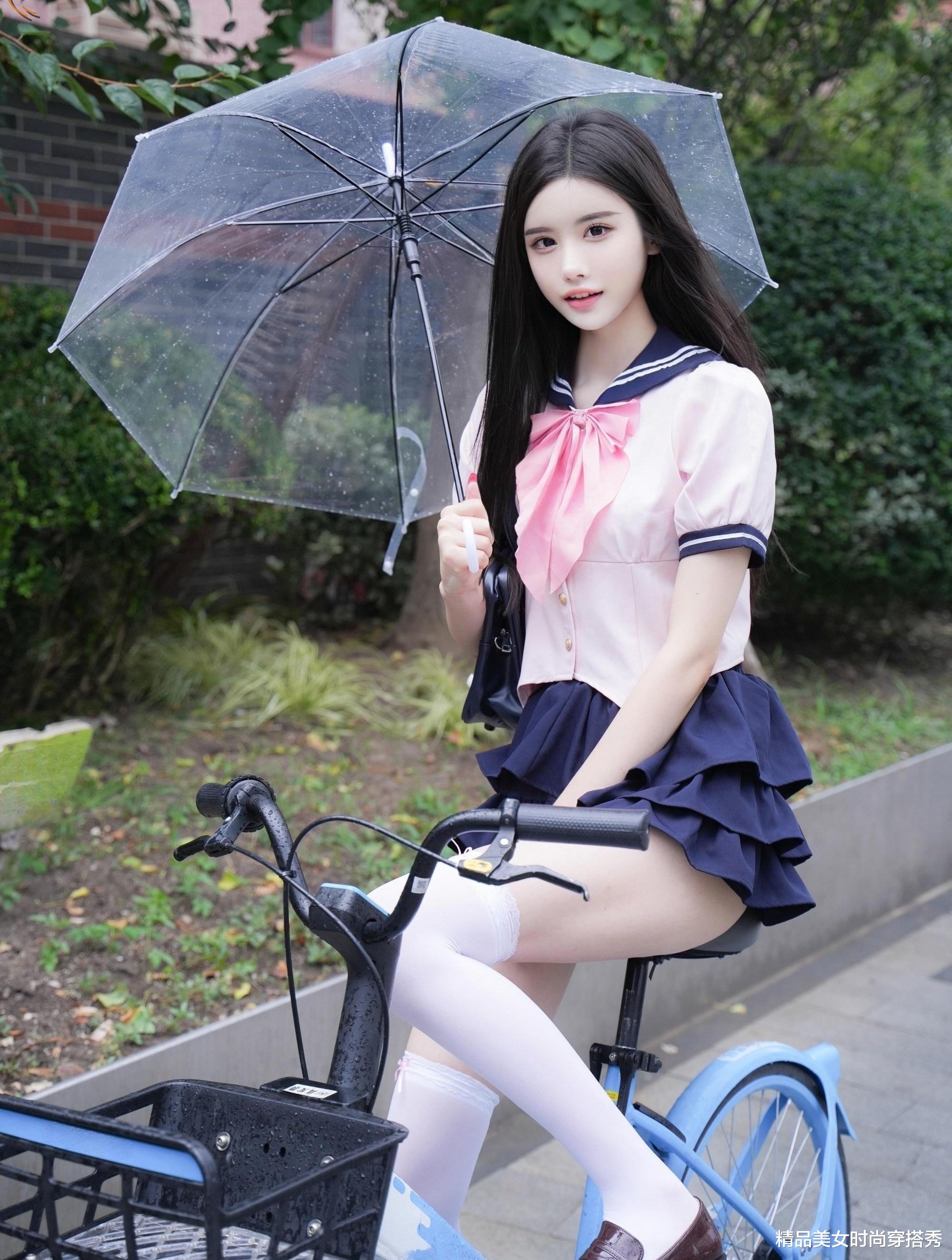 透明雨伞下的她,白色长筒袜与深棕色皮鞋相映成趣,每一步都踏出青春的节奏。无论是在雨中的巴士站静静等待,还是在狭窄的巷弄中悠然踱步,亦或是骑着单车穿梭于绿意盎然的小道,她都成为了雨中最亮丽的风景线。🌈