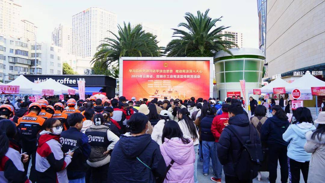 为深入学习贯彻党的二十届四中全会精神,引导广大职工增强法治意识、弘扬宪法精神,同时倡导职工共同承担艾滋病防治责任,共建共享健康生活,结合宪法宣传日、世界艾滋病宣传日,12月1日,2025年云南省、昆明市工会宪法宣传教育活动、职工防艾宣传教育志愿服务活动在盘龙区新迎新城顺利开展,面向广大职工同步宣传宪法知识与普及防艾知识。