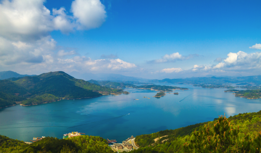 秋日的花亭湖,万顷碧波映着湛蓝的天空,乘一艘游船泛湖而行,微风带着湖水的清冽拂过脸颊,远处的岛屿如翡翠般散落在湖面,偶有水鸟掠过,留下一圈圈涟漪。