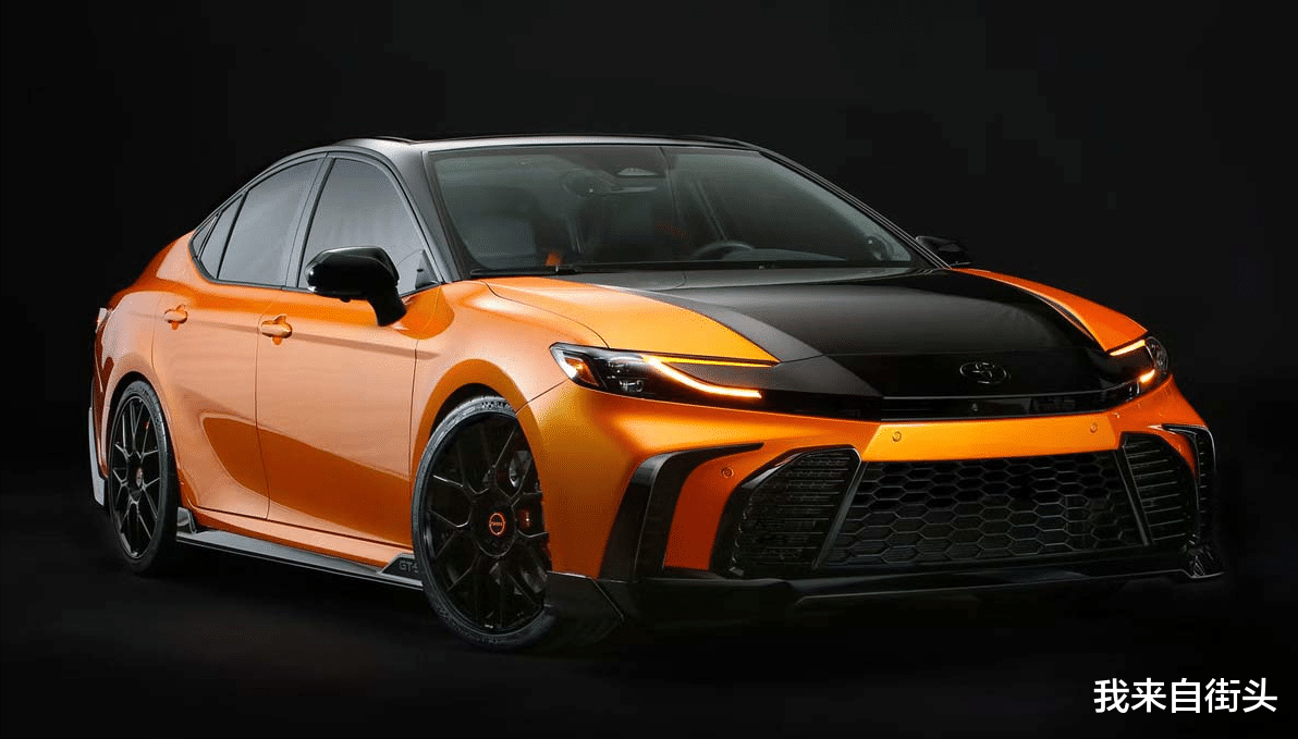 整车采用了极具侵略性的Inferno Flare橙红色涂装,搭配黑色车顶与半黑引擎盖,前脸上方那条连接头灯的黑色饰条更强化了层次感。前保险杠经过重新设计,格栅面积更大,两侧进气口更具赛车气势,看起来比现售的任何凯美瑞都更“杀气腾腾”。
