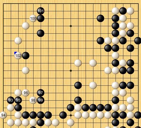 黑103虎,二选一。白104小飞,白棋的又一个问题手。黑105大跳,申真谞九段马上虎了一手棋。警报,解除了。