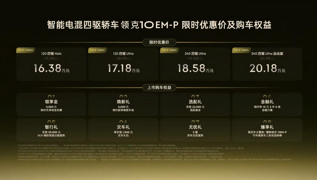 在价格权益方面,领克10 EM-P展现出了极大的诚意。新车共推出四个版型,限时优惠价16.38万元起。此外,领克10 EM-P还推出了5000元限时先享现金优惠、5000元限时超享焕新补贴、至高22000元选配基金、限时享10万2年0息金融方案等8重购车权益。用户在2025年9月8日至2025年10月31日期间完成领克10 EM-P大定锁单,且在2025年10月31日(含)前完成尾款支付及提车,即可享受上市限时专属权益。
