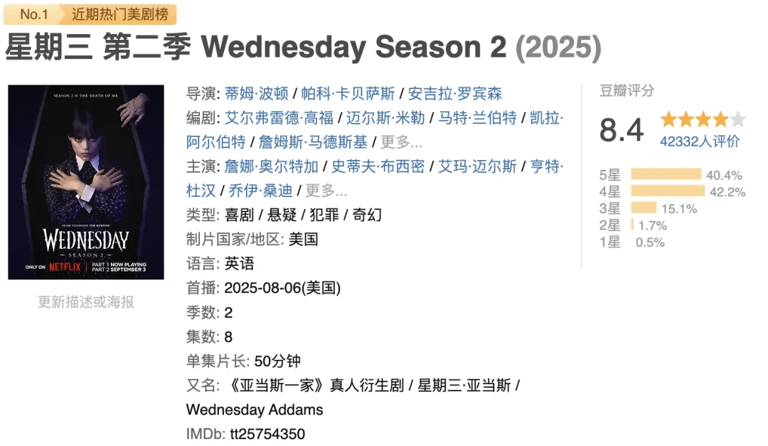 蒂姆·波顿掌镜,詹娜·奥尔特加继续饰演这位毒舌、厌世、却又聪明到极致的“异类少女”。