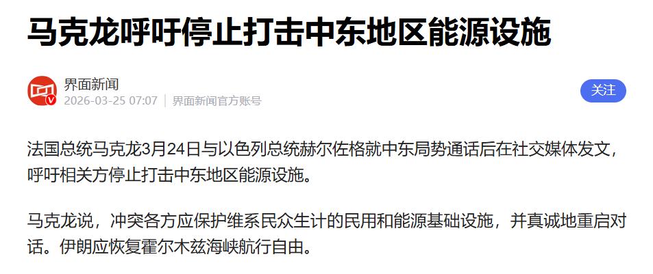 法国总统马克龙3月24日公开呼吁各方停止打击能源设施、恢复海峡航行自由——海峡问题已经不是美伊两家的事了,全世界都被拖进来了。 革命卫队3月24日还责令一艘擅闯海峡的集装箱船返航,态度很明确:这里的规矩,我说了算。
