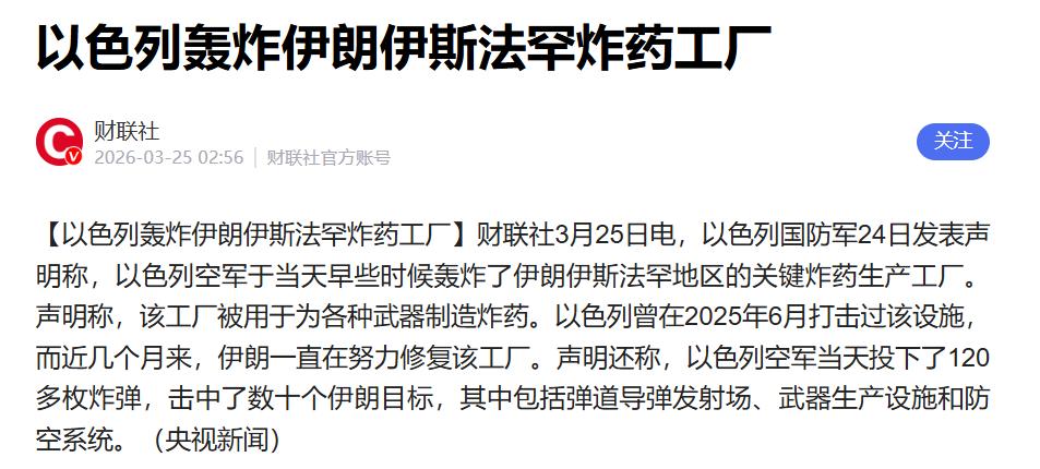 就在特朗普说"暂停打击能源设施五天"的同时,以色列空军轰炸了伊朗伊斯法罕地区的关键炸药生产工厂。