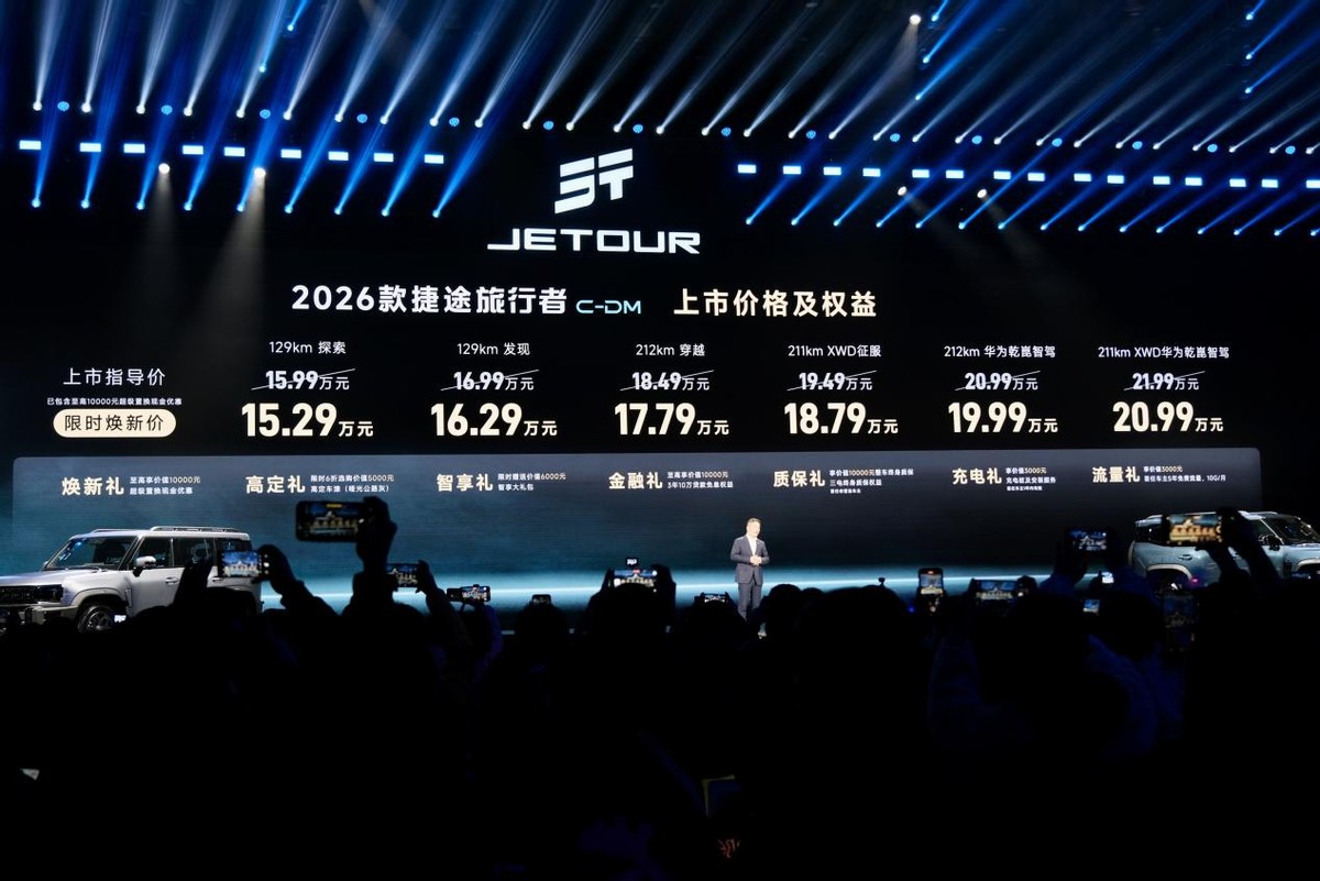 11月17日,2026款捷途旅行者/旅行者C-DM正式上市,新车共推出11款配置车型,其中,燃油版车型共5款,官方售价为13.99-17.99万元,限时焕新价12.49-16.49万元;C-DM混动版共6款车型,官方售价15.99-21.99万元,限时焕新价15.29-20.99万元。作为年度改款车型,新车主要针对细节设计以及配置进行了调整,同时官方还宣布,“山海T2”现正式更名为“旅行者C-DM”。