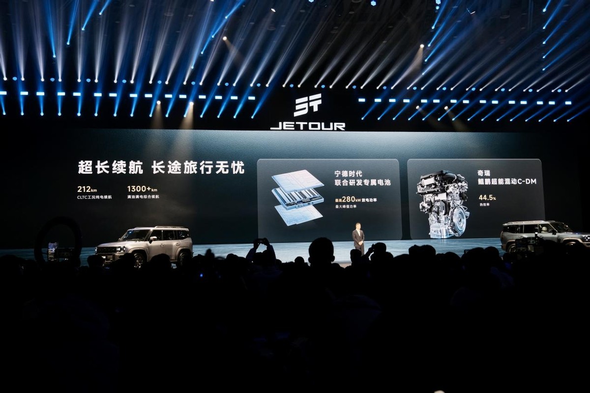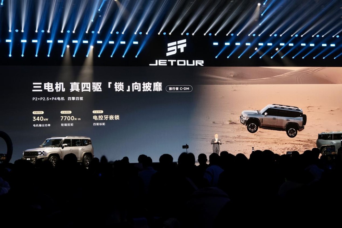 捷途旅行者C-DM混动版基于奇瑞鲲鹏超能1.5T专用混动发动机组成的插混系统,发动机最大功率为115kW,系统分别匹配双电机和三电机两种版本,双电机版本电机功率为165kW,最大扭矩390N·m;三电机版本电机功率为340kW,最大扭矩700N·m,系统综合功率为455kW,综合扭矩为920N·m,传动系统均匹配3挡DHT混动变速箱,三电机四驱版还标配电控牙嵌式差速锁。