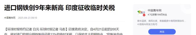 《进口钢铁创9年来新高 印度征收临时关税》——中国青年网