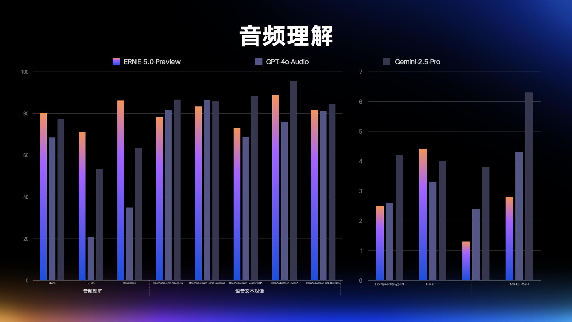 在音频理解方面,文心5.0 Preview的音频理解表现远超OpenAI GPT-4o和谷歌Gemini-2.5-Pro。
