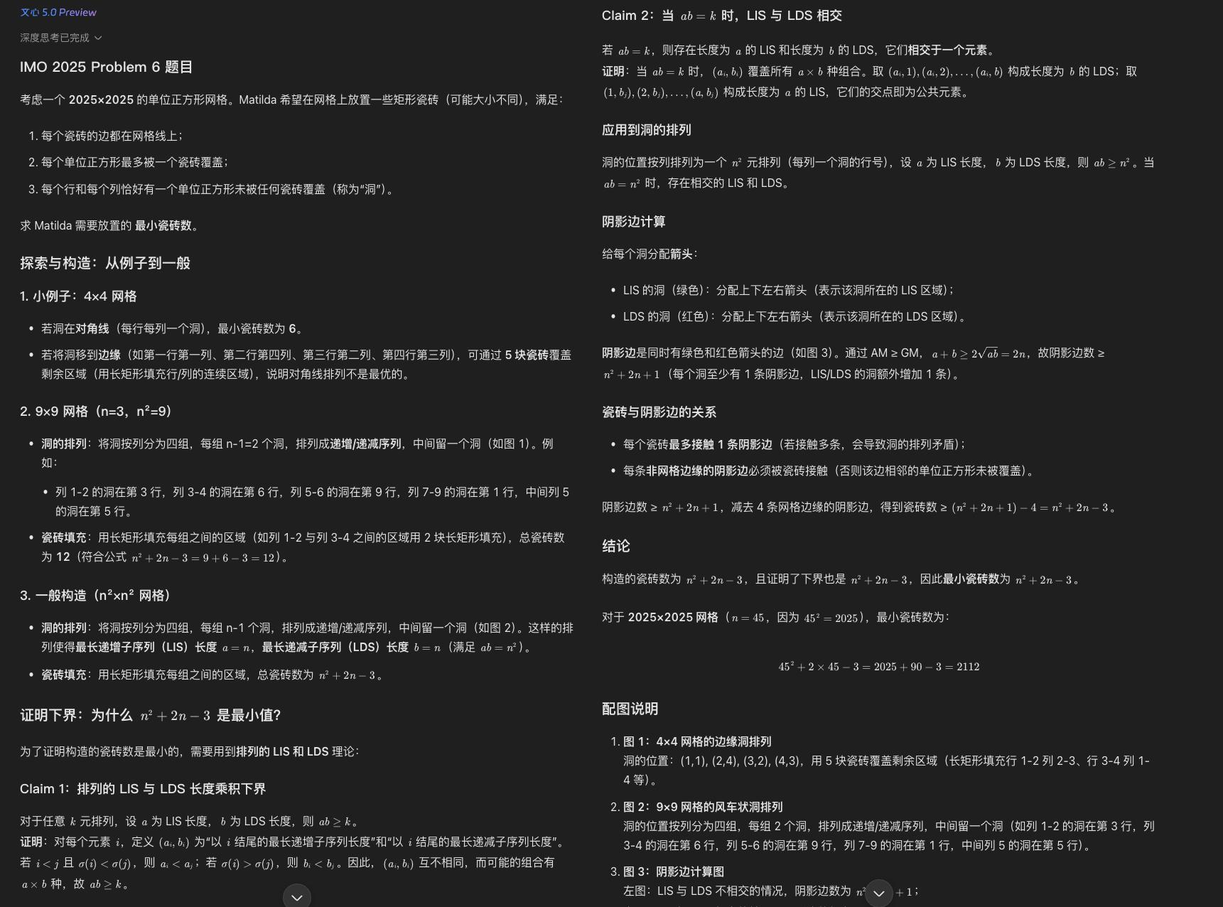 视频理解方面,智东西上传了一条IMO国际数学奥林匹克竞赛最具挑战的第六题解析视频,并要求文心5.0 Preview在保留解题步骤细节的同时,说明视频中所示图片的对应关系。文心5.0 Preview输出的解题过程清晰,并且在每个步骤都对应视频中配图进行分析,还在输出内容末尾处专门对配图进行了总结说明。