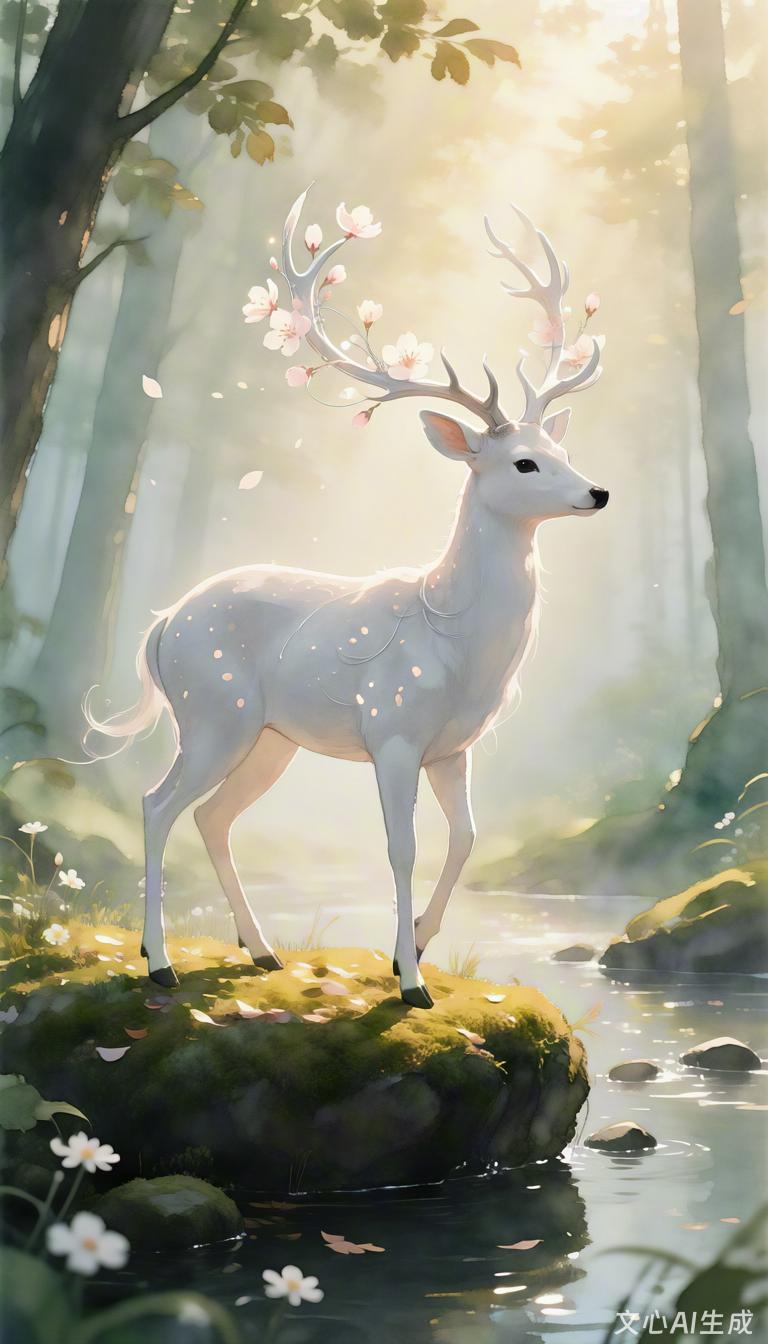 然后是复杂元素图片生成,智东西的提示词为:通体发光的白色小鹿,鹿角缠绕淡粉樱花与银线。小鹿四蹄踏在漂浮的青绿色苔藓石块上,在清晨雾感森林,阳光透过树叶形成光斑,地面铺着落叶与白色小花,远处有溪流反光。