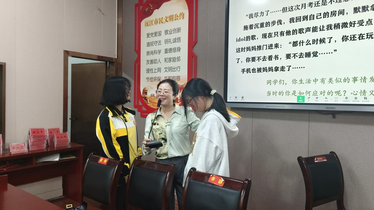 学校严格开足开齐国家心理健康课程,七年级每周 1 节,八/九年级单双周授课,每月1次心理班团活动课由专职教师与班主任协同教学。同时开发校本课程,通过“幸福大讲堂”、心理电影、团辅游戏、校园心理剧等载体,构建”全学科渗透”模式。如语文教学融入人格教化,理化学科结合科学家成长故事,让心育元素自然融入各学科教学。语文教师将朱自清的散文与青春期亲子沟通主题结合,这样的“心育+学科”融合课每周都会上演。学校严格执行七八九年级单双周授课的国家课程标准,同时开发《初中生心理成长手册》校本教材,其中“情绪管理”单元设计的“愤怒温度计”游戏,已成为最受学生欢迎的课堂活动。