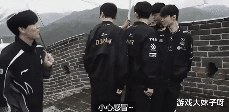 当天北京的天气并不理想,细雨笼罩着长城的石阶,风也带着几分寒意,两支队伍并未提前约好,彼此在长城相遇时都略显惊讶,iG的队员正准备下山,而T1则刚好上到拍摄点,就在双方擦肩而过的那一刻,镜头记录下了一个温暖的瞬间——TheShy笑着提醒T1的选手们:“下雨天,小心感冒。”