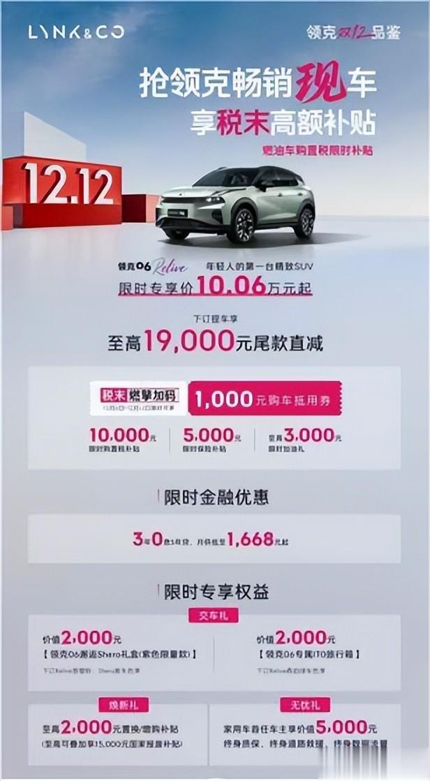 说到年底买车,很多人第一反应就是“价格能不能更低”。领克06 Relive在12月给出的福利可以说很直接——限时专享价10.06万元起,可享购置税补贴、保险补贴,以及加油礼等礼遇。交车还有小惊喜,比如特定车色可获得限量礼盒或旅行箱,金融方案支持5年期贷款3年0息,月供低至1668元,置换旧车还能叠加享受国家报废补贴和额外积分。