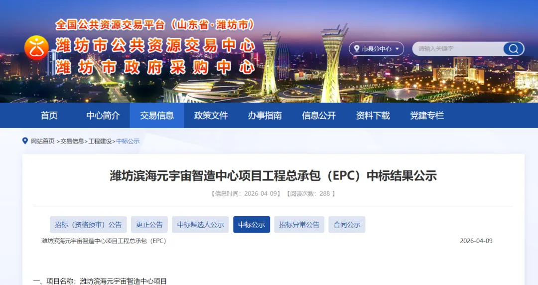4月9日,全国公共资源交易平台公布的信息表明,备受行业瞩目的潍坊滨海元宇宙智造中心项目工程总承包(EPC)项目中标结果已揭晓,由中建八局第一建设有限公司与潍坊一家投资有限公司组成的联合体成功中标该项目,项目总预算为7.2亿元。