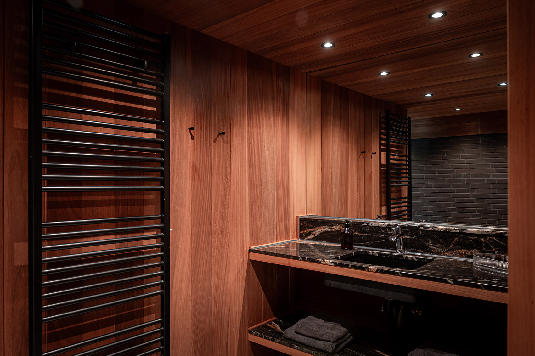 度假屋的浴室和客房位于房屋较为封闭的后部。浴室下沉和楼上全尺寸的卧室构成2层。室内的装饰采用了Ayous木材,一种经过热处理的木材。整体简洁整齐,融于自然之中。加热汞提供热水和供热,房屋还配有自己的废水处理系统。