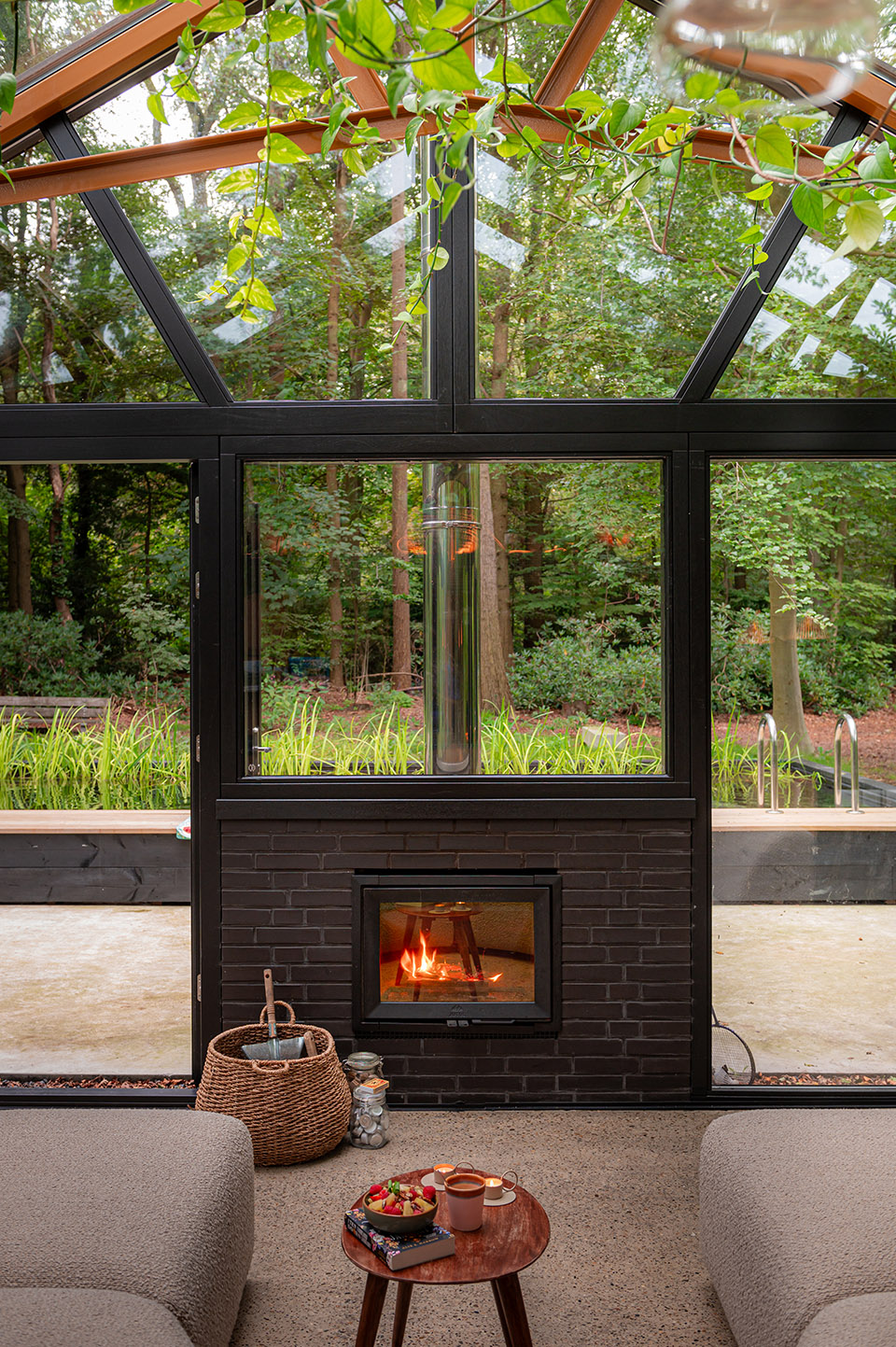 酒店占地面积有限,但是设计师通过运用不同的楼层,创造了宽敞的室内空间,中央是一处美丽的融合了厨房和酒吧的休息区,前方有一个内置的木制火炉。玻璃构造实现在室内无缝衔接森林景观,看到松鼠在大树上跑来跑去,小鹿穿过森林。