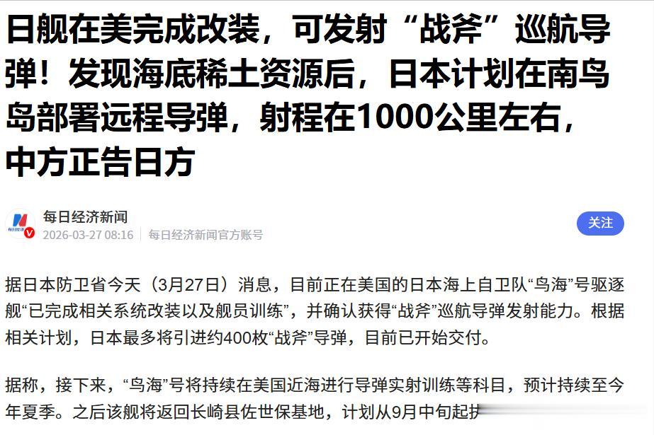 信息来源:日舰在美完成改装,可发射“战斧”巡航导弹!发现海底稀土资源后,日本计划在南鸟岛部署远程导弹,射程在1000公里左右,中方正告日方