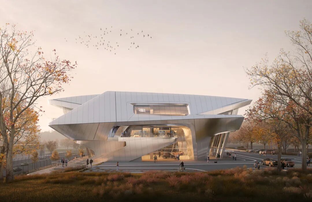 建筑本身是品牌理念的物质化呈现。领克成都MEC的设计灵感直接来源于品牌“生而全球,开放互联”的核心价值观,并通过将“都市对立美学”这一品牌基因与具有未来感的建筑解构主义手法进行深度融合,最终塑造出一个被比喻为“时空飞船”的建筑意象,旨在吸引并连接当代都市青年与汽车运动文化。其外观造型强调科技感与未来感。建筑外立面由不规则几何切割与流畅曲线交织而成,充满了动感与力量感,整体形态隐喻着一艘即将启航的宇宙飞船,代表着对速度、变革与未来能源的向往。外墙面采用的银色铝板幕墙,由多块弧形反光板构成,能够捕捉并反射不断变化的光线和环境景象,这一设计不仅增强了建筑的动态视觉效果和未来主义特质,也使其与周边环境建立了强烈的视觉对话。通过为不同使用功能配置不同高度的观赛视角,建筑实现了形式与功能的高度协同,其流动的曲面外形不仅构成了强烈的视觉标识,也内在呼应了领克品牌对于性能、新能源与设计整体性的追求。