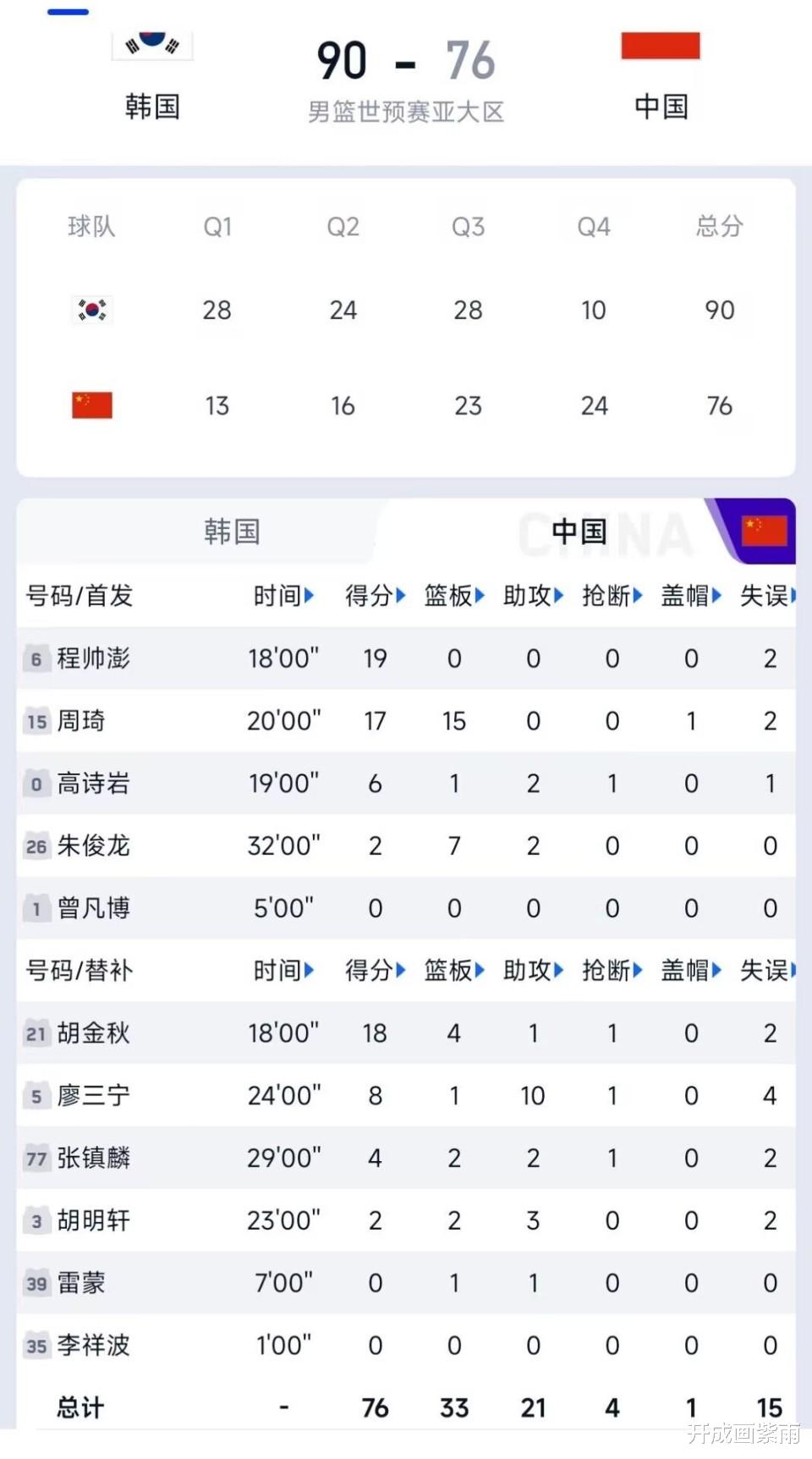 又输了,中国男篮客场以76-90惨负韩国,世预赛两连败!张镇麟上半场0分0篮板0助攻,正负值-19!胡明轩,正负值-25