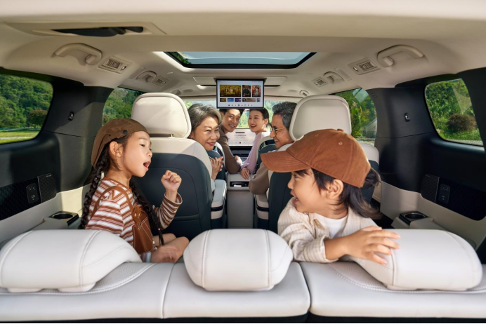对妈妈们也挺友好,这车能和家里的智能设备连起来。比如夏天出门前,在家就能先把车里的空调打开,上车就凉快了。快到家的时候,也能远程把家里的空调、热水器打开。儿童安全座椅也智能,抱着孩子靠近车门,它会自己转过来方便放孩子。车里还有摄像头可以随时看看后排的宠物,挺方便的。