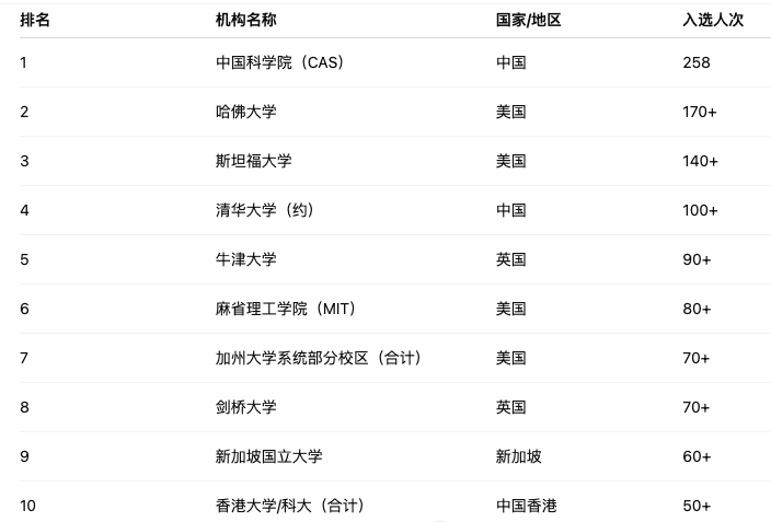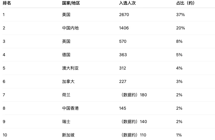 从国家层面来讲,全球科研力量比较集中,今年前五个国家占据了超出74%的入选份额,前10的国家占比更是达到86%,全球科研话语权,还掌控在少数国家手里。