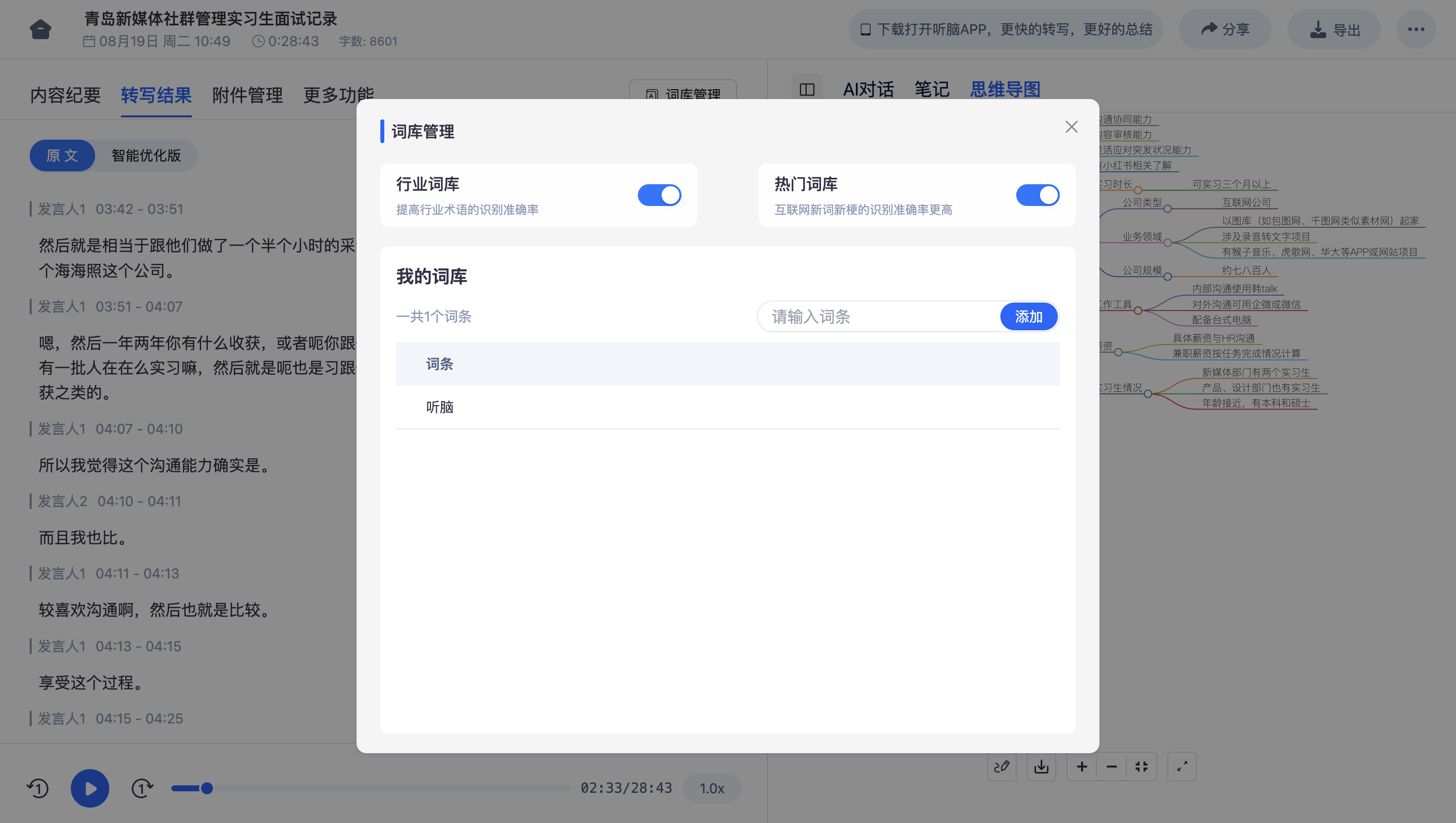 后来慢慢摸索,发现它的功能比我想的全。比如多语言转写,上周帮国外客户整理电话会议,我选了英语模式,结果转出来的文字连“API接口”“用户留存率”这些专业术语都没搞错,比我自己听译快了整整一倍;还有方言识别,我妈是四川人,上次给我发语音吐槽“邻居家的瓜娃子又把垃圾丢在门口”,我用听脑AI转,居然把“瓜娃子”都准确识别了,还贴心地在后面标了“四川方言:指调皮的人”,瞬间觉得这工具挺懂生活的。最让我意外的是它的“智能分析”功能。我写公众号的时候,总卡壳——坐在电脑前半天想不出大纲,后来我试着把口述的思路录下来,比如“这篇文章要讲三个点:为什么要做知识管理?常用的工具推荐?具体操作步骤”,转出来的文字直接就是分点的大纲,甚至还帮我补全了没说完整的句子(比如我说到“工具推荐”时顿了一下,它自动加了“比如笔记类、思维导图类”)。现在我写内容都习惯先口述,再用它转大纲,创作效率至少提升了70%,再也不用对着空白文档发呆了。对了,它的云端同步特别方便。我有时候在地铁上想写点东西,就用手机录语音,到公司打开电脑,转好的文字已经同步过来了——不用像以前那样传文件,省了好多麻烦。还有团队协作功能,上次和同事一起做项目,我把客户访谈的录音转好后,直接分享链接给他们,他们可以在上面批注“这里客户提到了预算问题”“这个需求要重点跟进”,不用来回发文档,效率高了好多。当然,它也不是完美的。比如有时候网络不好的时候,转写会有点慢,不过等网络恢复了,它会自动继续,不会丢内容;还有一次遇到一个语速特别快的销售录音,转出来漏了几个字,我检查的时候改了一下,不影响整体效果。这些小问题对我来说都不是事儿,毕竟比起以前手动整理的麻烦,这点小瑕疵根本不算什么。