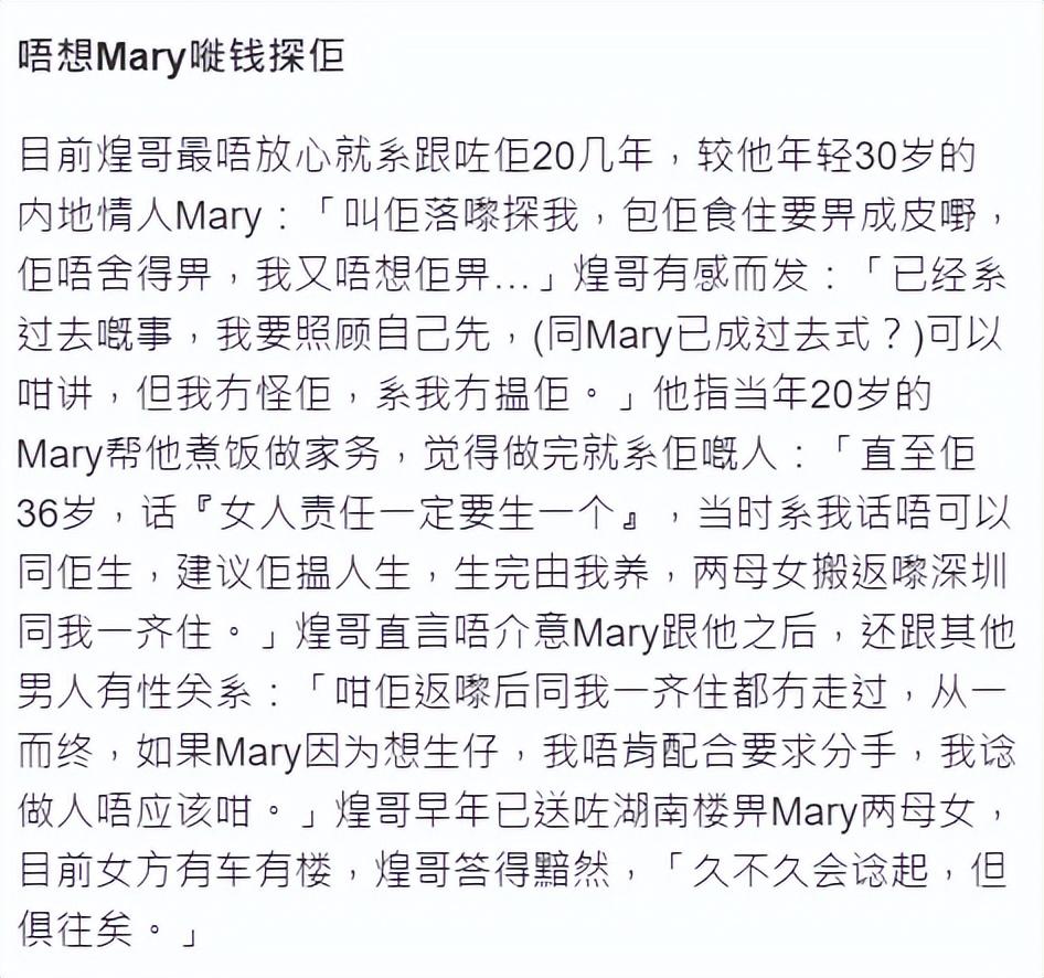 在这之后,由于自己没钱,而且TVB也不和他续约,他也无戏可拍,导致生活水平一再下降,甚至到了贫瘠的地步,即使这样,他也要每个月给母女二人两三千块钱。