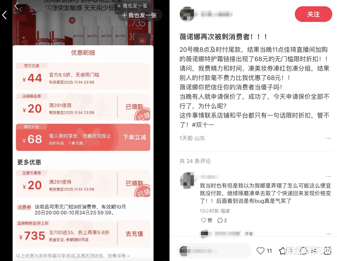 10月20日当晚8点,不少在李佳琦直播间下单薇诺娜产品的消费者付完尾款发现,自己参加预售后的实付金额竟然比直接买更贵,深究之后才找到原因:原来在20日晚上现货开售时,一些新下单的用户收到了平台68元、89元的大额限时限量补贴,而参加预售的消费者只有20元、30元不等的小额店铺优惠券。