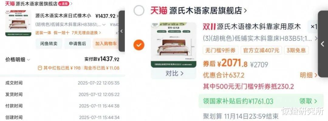 有用户在社交媒体上晒出截图,7月份源氏木语的橡木床售价为1647元,实付款为1437.92元。但眼下双11售价却涨到了2709元,券后价为2071.8元。双11前,云鲸扫地机器人的扫地机器人链接详情页显示活动券后价2641.54元,但是20日晚8点后的补贴后价格就变成了3036.28元,坐地起价近400元。