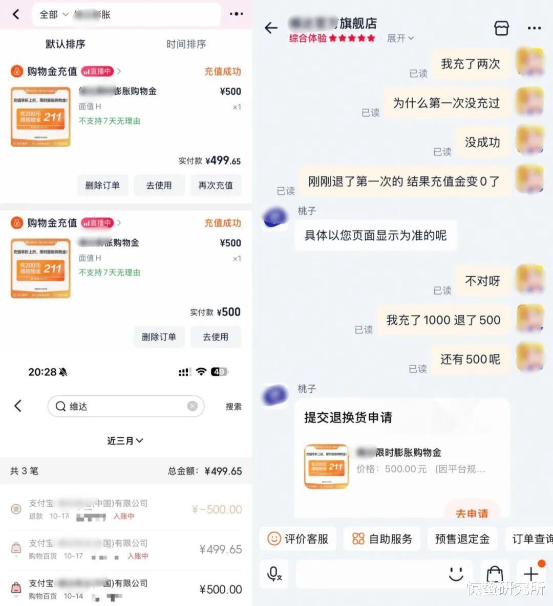 *网友晒出的“购物金充值未到账”截图