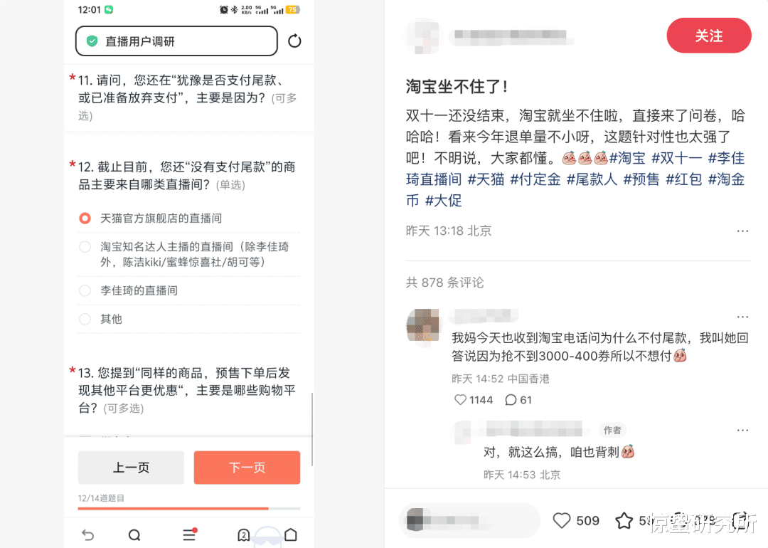 或许是因为消费者的怨气通过未付尾款的订单里传递给了平台,双11正式开启没几天,就有用户在社交媒体上晒出自己收到淘宝天猫平台的问卷调研,表示被询问没有及时支付尾款的原因等问题。而这条笔记的评论区,也瞬间变成今年双11的“吐槽大会”。