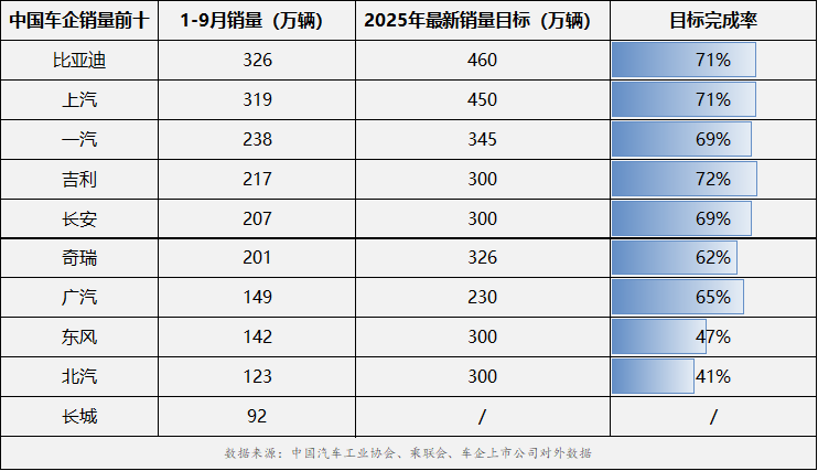 从销量榜单头部阵营看,比亚迪与上汽集团组成"双雄争霸"格局。比亚迪凭借326万辆的累计销量(完成率71%)稳居榜首,其新能源赛道优势持续扩大;上汽集团则以319.3万辆的成绩紧随其后,展现出老牌车企的韧劲。在第二梯队(200万辆量级)中,吉利汽车以217万辆的累计销量实现72%的目标完成率,完成率位列前十车企首位。