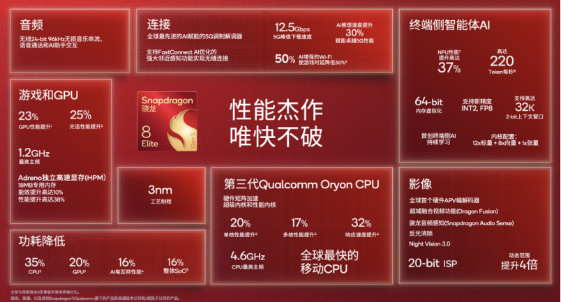 作为“全球最快的移动SoC”,第五代骁龙8至尊版在各个环节都有大幅升级。它采用3纳米工艺制程,第三代Qualcomm Oryon CPU最高主频达到4.6GHz,性能提升了20%,全新架构的高通Adreno GPU带来了23%的图形性能提升,高通Hexagon NPU性能更是提升了37%。