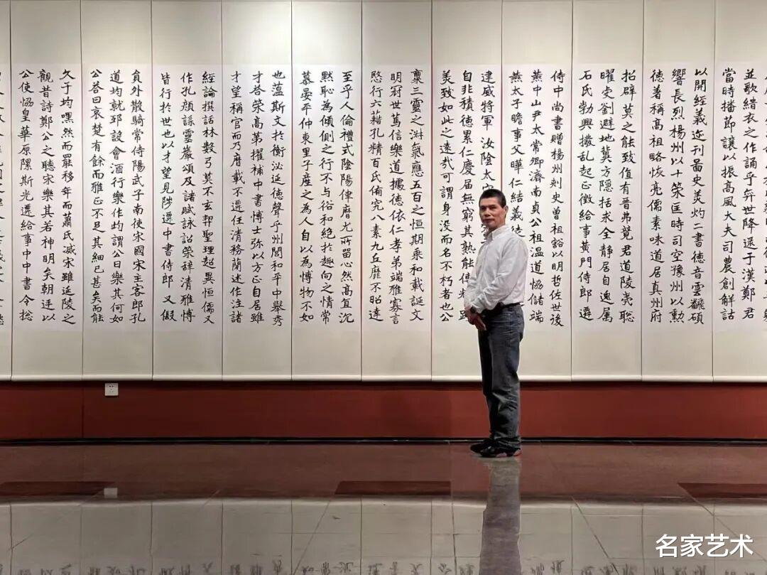 机遇总是青睐有准备的人,今年恰逢程十发艺术馆成立十五周年,艺术馆诚邀小周举办个人书法展。小周以虔诚之心,创作数月。所书中堂、对联、条幅、长卷等均能穷究夲源,融汇贯通。其至心奉法,敦修慧业之心跃然纸上。他说他心里始终铭记着我父亲给予他年青时期的寄语,“在书艺路上只有焚膏继晷,缁衣三千的精神状态,心有高峰才能争上彼岸!”