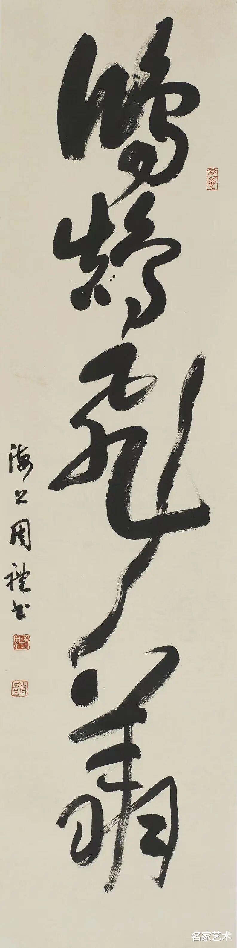 周国全的书法,讲究规矩,讲究笔法,以致于布局章法,都在传统规矩之中,既体现在他的楷书、隶书上,也落实在行书、草书中,如果说周国全的书法作品只是通常的尺牍条幅大小,那么,这种中规中矩就是传统功力的呈现;实际情形是周国全擅长六尺的大幅,甚至是八尺的巨幅。尺幅的扩大,当然不仅仅是字的放大,无论在章法、结构,还是线条笔法上,以至于干湿、渗化都与小幅不同。这就有了在规范中寻求突破规范的可能。这种突破欲,其实就是周国全要在书法创作中实现生活的意义和生命的圆满。所以,周国全把书法看得很重,视若性命。对每一幅作品都极其隆重、认真,往往在精心构思酝酿之后,还要反复推敲。因而,既成的作品看似流畅率意,实则匠心昭然。周国全大幅书法作品所体现出的强烈的气势感,是和他将生活以至于生命的意义和价值寄托书法相关联的。