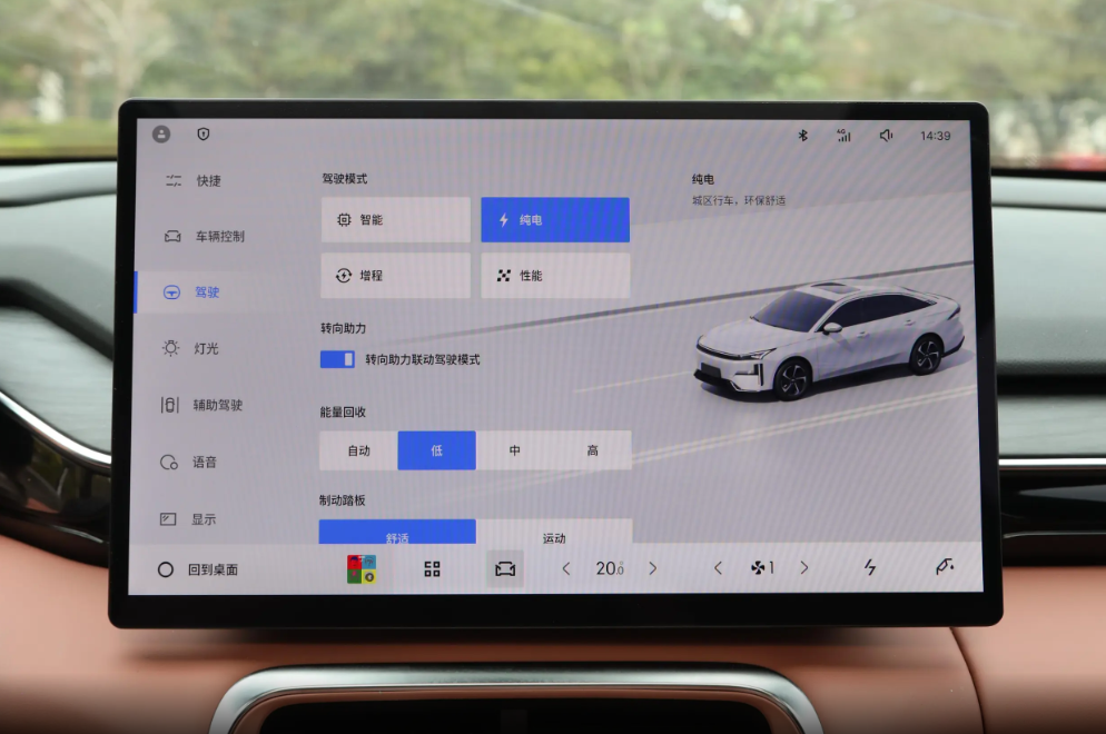 说实在话,比起这款车型的外观设计,我个人并不是很喜欢它的内饰设计。在进入这款车型的座舱后,我发现它采用了多种不同的材料装饰,是可以让人得到一些精致感的。但是这些让人得到精致感的设计,却在一定程度上影响了它的“简约风格”。当然,每个人的审美喜好都不同,所以我这里就不细谈它的内饰设计了。相比之下,这款车型标配的14.6英寸悬浮式中控屏更吸引消费者的视线。
