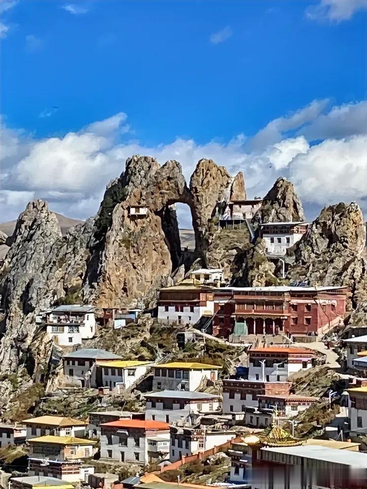 孜珠寺最险要最刺激最壮观的是天门洞,比之张家界天门洞,不知凶险好多倍。那天门洞顶周边,还有若干苯教大师古老的修行山洞,而抖音宣传最出彩的是悬崖上“世界最高蹲坑厕所”,比天门洞海拔还要高。