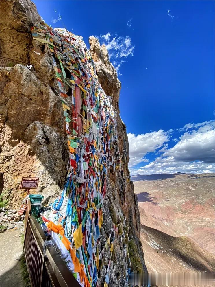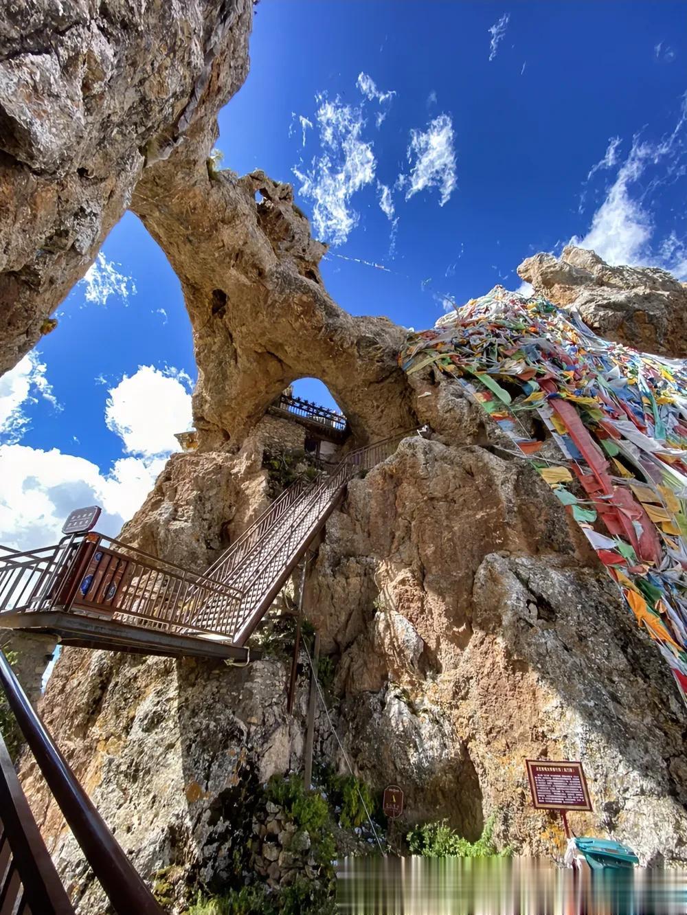 天门洞上好风光,但朔风猎猎,呼呼作响,那风吹得人手不敢松栏杆。天门洞的另一面,是挂满彩色经幡的万丈深渊,往下瞧,头晕眼花,双腿发软。