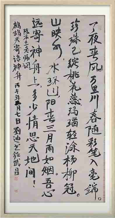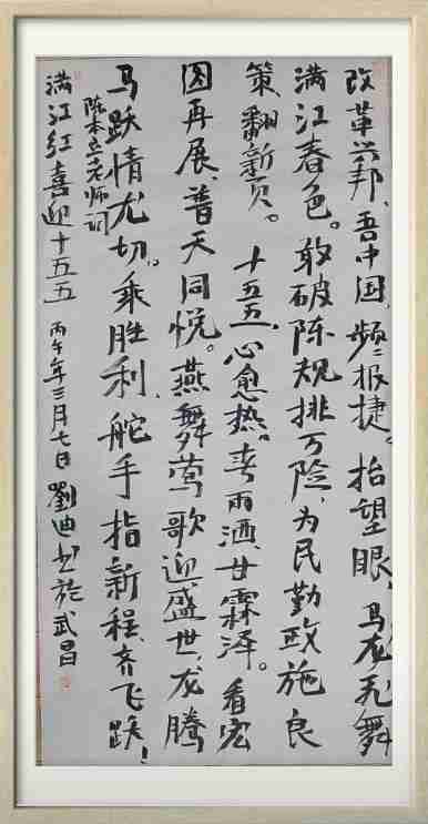 I have been engaged in banking for over 40 years and have been retired for seven years. I have participated in and won awards in calligraphy and painting competitions organized by the Provincial Industrial and Commercial Bank multiple times. In 2022, the Industrial and Commercial Bank of Hubei published "Beautiful Articles, Making the Elderly Feel Useful," and in 2023, it published "Beautiful Articles" five times. In 2023, when the Beijing Chuangrong Art Center solicited outstanding calligraphers and painters nationwide, my works were discovered by Teacher Guo Tao and recommended by Media Song Jian. In Song Jian's interview, "Galaxy Splendor, Artistic Path Renewal," "Shining Again," "Red Heart Builds Dreams, Brush Shines," Liu Di - A Tribute to the 97th Anniversary of the Founding of the People's Liberation Army was exhibited artistically. The works were broadcast on seven major media platforms including Today's Headlines and received a certificate of selection, marking the inclusion of artistic creation in the history of national rejuvenation. An exclusive interview with Liu Di was conducted by Artron Headlines. In 2024, I was interviewed by Song Jinfeng, the chief editor of the Literary and Art Department. On August 31st, Beijing's "I Say to the Motherland, Celebrating the 75th Anniversary of the Founding of New China" special program - Liu Di's Aesthetic Public Class was broadcast on seven major media platforms including Today's Headlines, receiving widespread praise. The group leader of Fenfen invited me to join the group, which includes China Literature and Art, Zhongding Shengshi Culture, Forbes Da Vinci, Artron Baojiatang Calligraphy and Painting, Jin Gu Legend Wuhan Calligraphy and Painting, for learning and exchange. I am an amateur calligraphy and painting enthusiast, and there is still a long way to go in learning calligraphy and painting. I am very grateful for the help from enthusiastic people! I would like to thank my teachers who helped me with calligraphy and painting, Liang Yan, Min Ming, Guan Huiping, Xing Wenguang, and Chen Benli who helped me with poetry. I would also like to thank Ms. Guo Tao, Teacher Song Jian, Ms. Xie Suxia, Ms. Li Na, Ms. Kong Ying, and Ding Sen, the group leader, who helped me with media promotion. My achievements are inseparable from your encouragement! Thank you all. In the future, I will repay society with my best works.