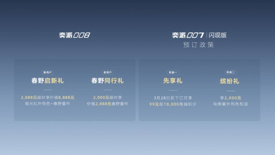 针对奕派008,新用户可享2888元限时选购价值8888元的极光红外饰色+春野套件,老用户则可享2000元限时选购价值2888元的春野套件,权益有效期为3月14日19:00至3月31日24:00。奕派007闪现版预订用户可在3月28日前享受99元抵10000商城积分及价值2000元电御紫外饰色权益。