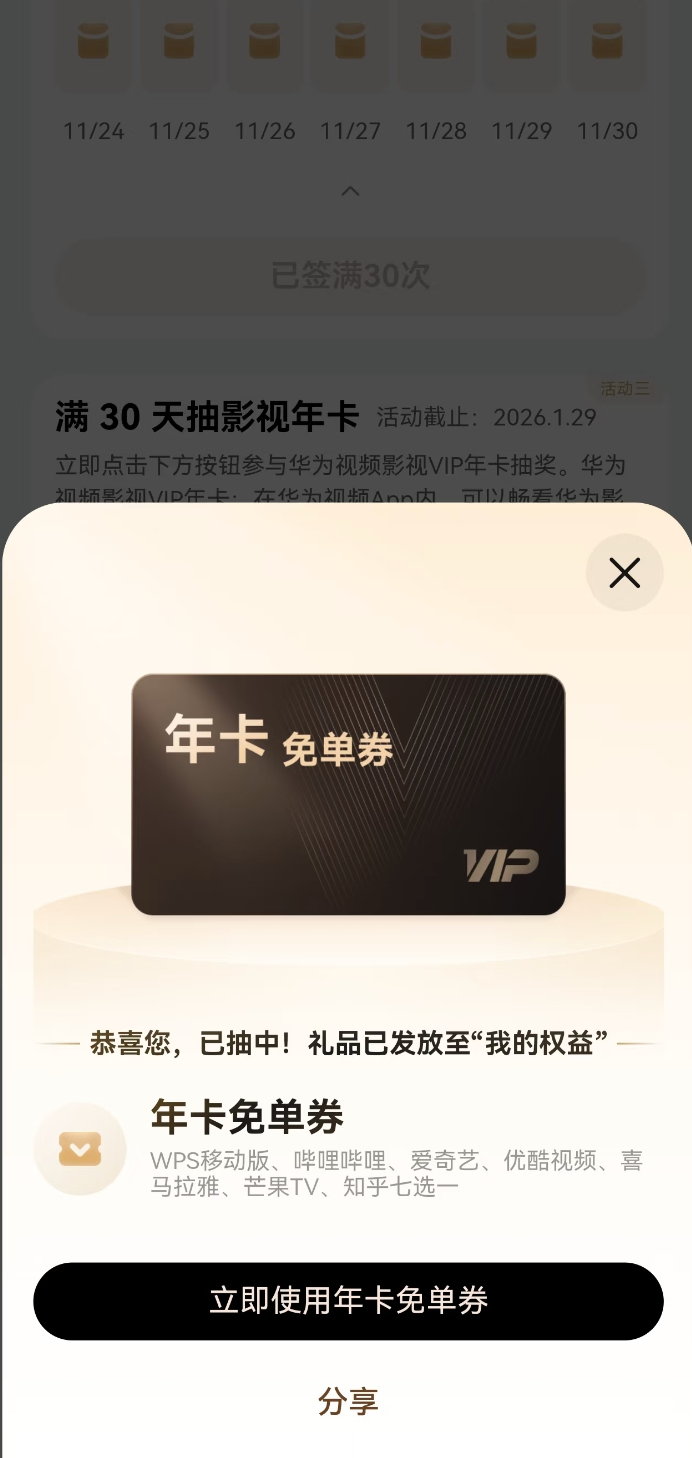 具体来说,活动的操作超简单:升级系统后,在桌面右滑就能在负一屏找到“鸿蒙有礼”活动入口,进去每天签到打卡就行,每天都能收获到一份现金红包和随机福利,如果有幸抽到月卡免单券,就能兑换芒果TV会员了。首次签到满30天后,还能参加热门应用年卡抽奖,抽中后可以从WPS移动版、哔哩哔哩、爱奇艺、优酷视频、喜马拉雅、芒果TV、知乎中七选一,里面就有我刚需的芒果TV年卡!
