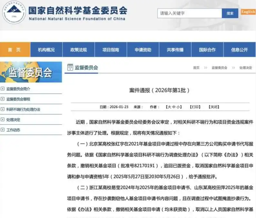 今年1月23日,国家自然科学基金委员会网站通报2026年第一批科研不端行为案件情况,46名学者学术不端,被集中通报批评!