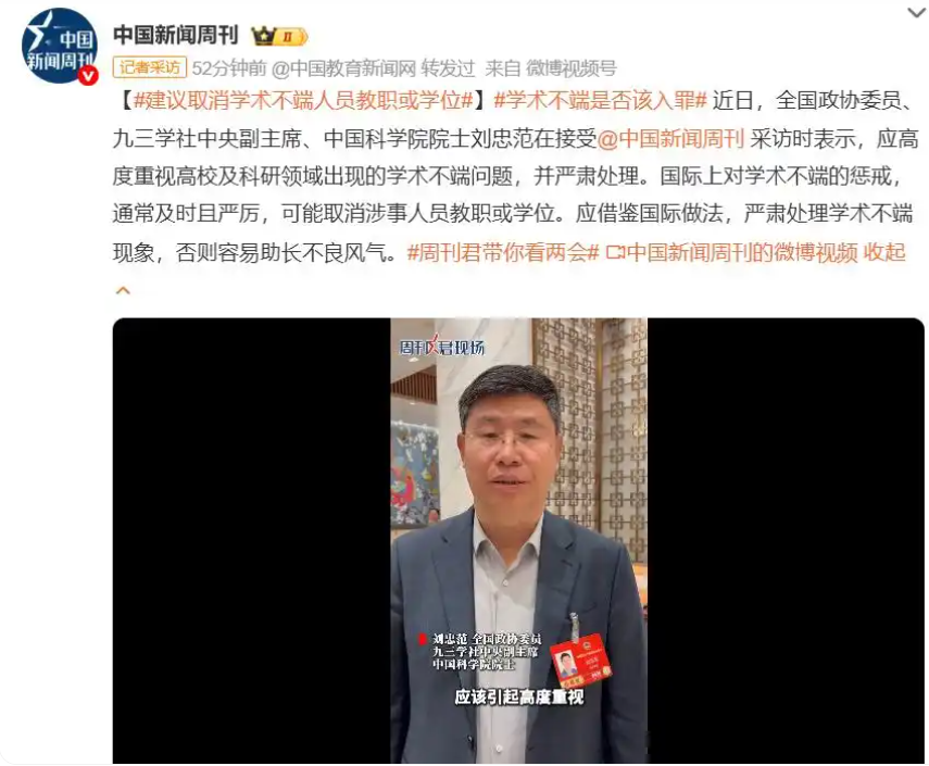 值得关注的是,今年“两会”全国政协委员、九三学社中央副主席、中国科学院院士刘忠范在接受中国新闻周刊采访时表示,应高度重视高校及科研领域出现的学术不端问题,并严肃处理。国际上对学术不端的惩戒,通常及时且严厉,可能取消涉事人员教职或学位。应借鉴国际做法,严肃处理学术不端现象,否则容易助长不良风气。