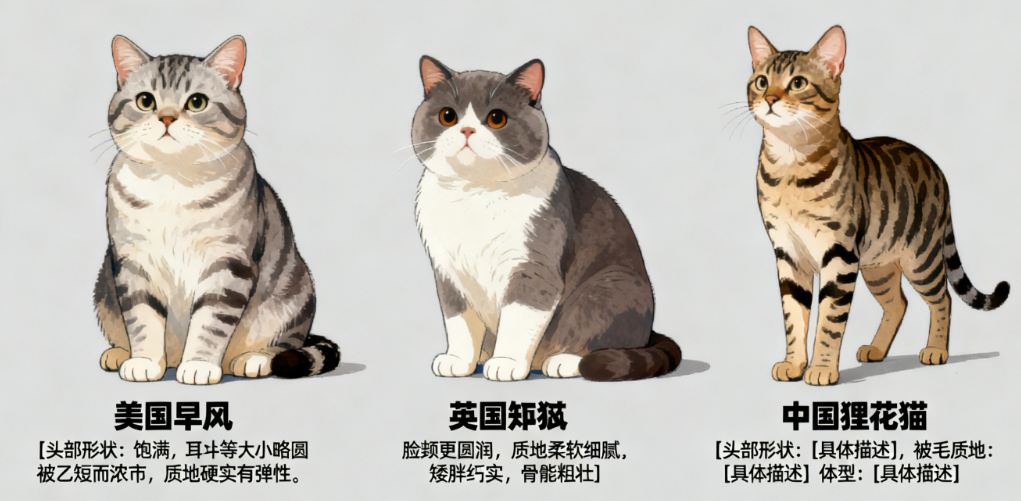6.2 鉴别要点美国短毛猫常被与英国短毛猫、中国狸花猫混淆,可通过以下特征区分: