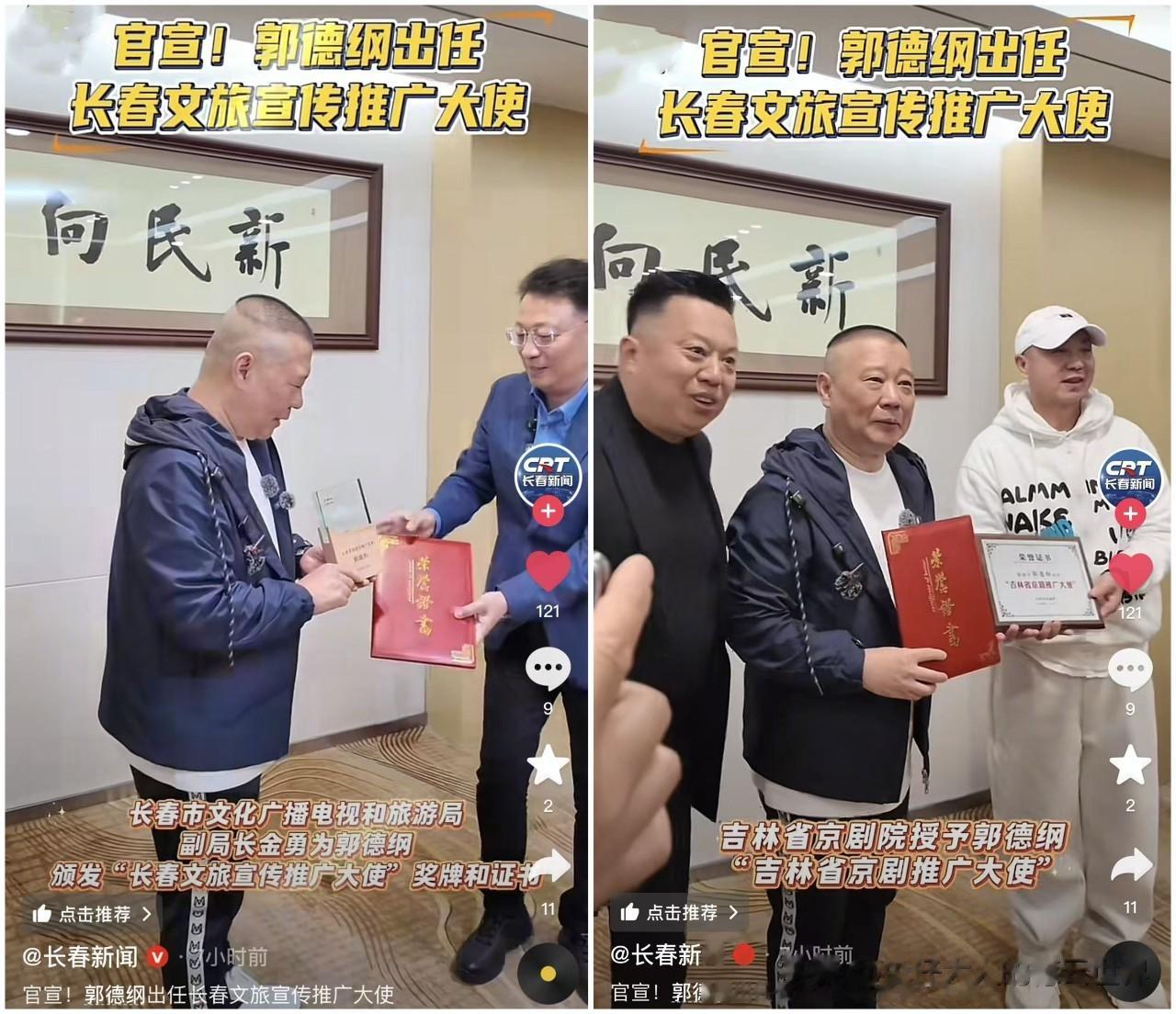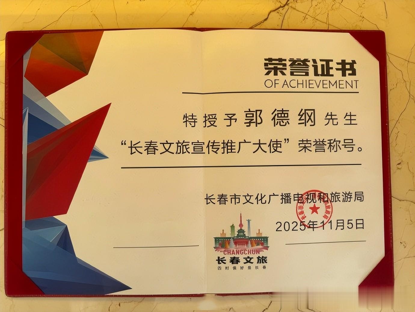 第三份,是来自长春市文化广播电视和旅游局的荣誉证书,授予郭德纲“长春文化宣传推广大使”的称号。能够先后得到长春市、吉林市文旅部门的支持和认可,这是一份殊荣。德云社玩的是传统曲艺,文旅部门向郭德纲抛出橄榄枝,是对德云社整体的认可。多多到当地来演出,拉动当地的文旅产业发展。从德云社在长春的演出安排频率来看,郭德纲是担得起这个荣誉称号的。