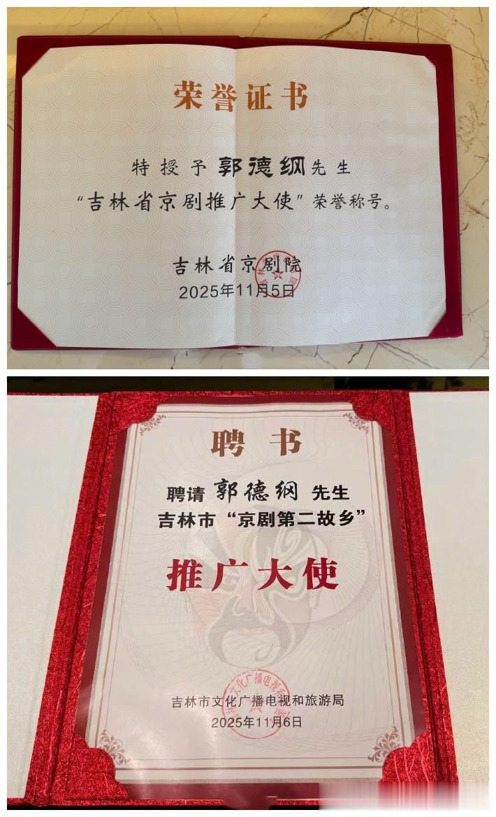 第二份,来自吉林省京剧院的荣誉证书,授予郭德纲为“吉林省京剧推广大使”。与吉林省京剧院不谋而合的,是吉林市文化广播电视和旅游局。吉林市文旅局聘请郭德纲为吉林市“京剧第二故乡”推广大使。这是在京剧方面对郭德纲的肯定和认可。自从麒麟剧社全国巡演开启,无论在票房、上座率,还是在社会影响和京剧传播等方面,麒麟剧社的成绩和收获是有目共睹的。来到吉林唱戏,能得到政府部门和业界的认可,是名副其实的。