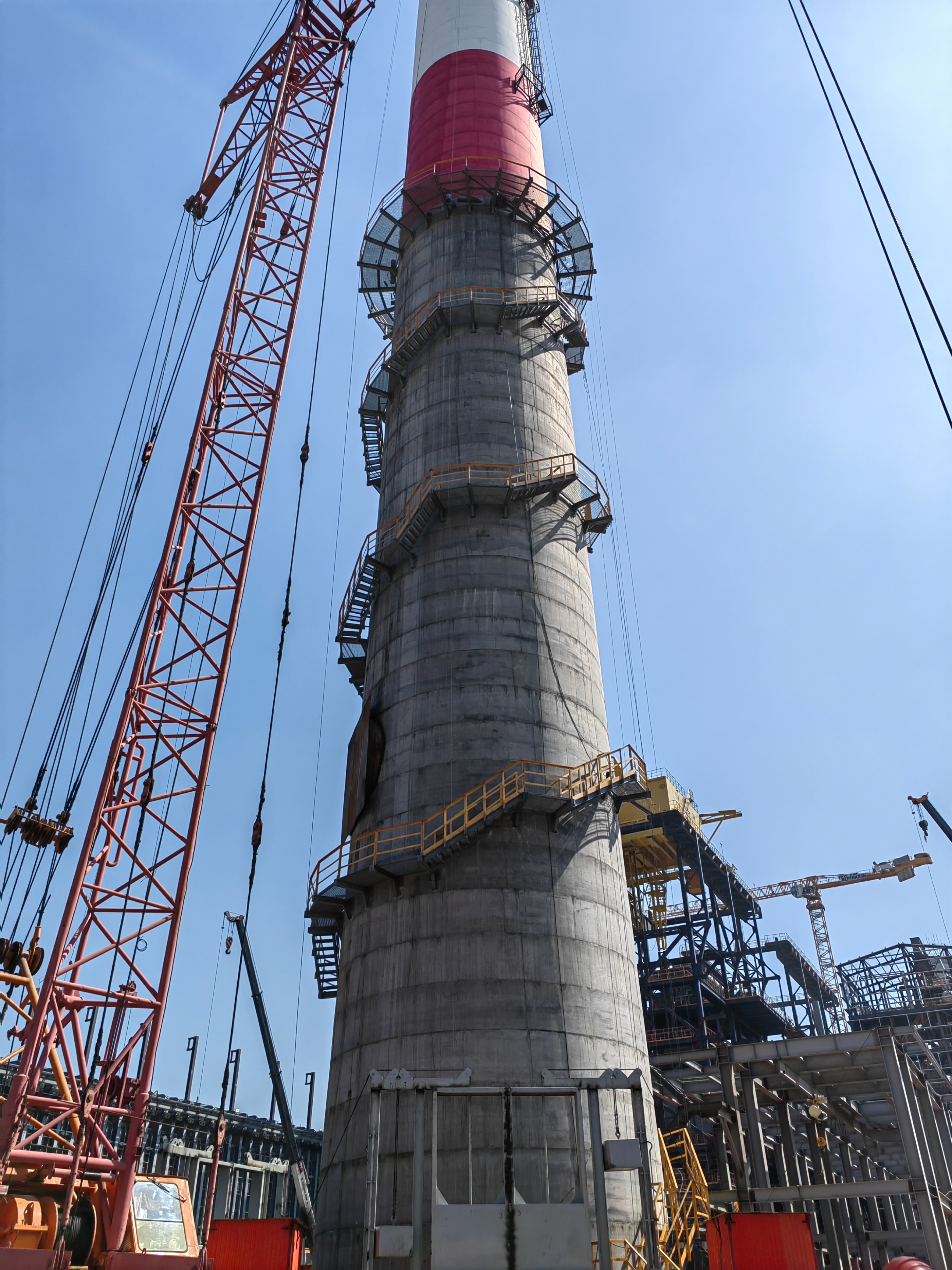 以烟囱 ±0.00m 基准点,用激光铅垂仪标定爬梯起点、螺旋轨迹及每 5m/8-10休息平台位置;